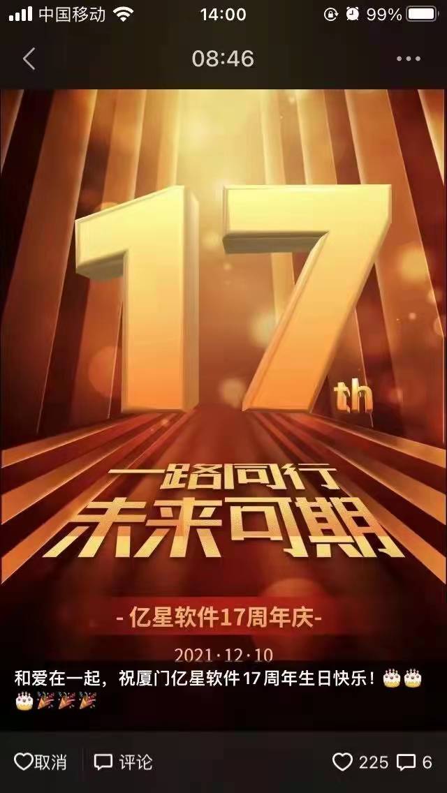 “德化亿星、潮州亿星、广州分公司、阳江办事处:祝亿星软件17周年庆生日快乐!”此起彼伏,饱含深情的祝福声从云端传来,汇聚在厦门公司总部,爱的暖流在整个亿星总部、在每一个分公司和办事处如春潮般涌动,在每一个亿星家人的心中激荡,听着、看着、欢呼着,感动着,17年的风风雨雨,在此刻都化作最美好的祝福与期待,凝聚成坚不可摧,战无不胜的力量,从这里再次扬帆起航、乘风破浪!